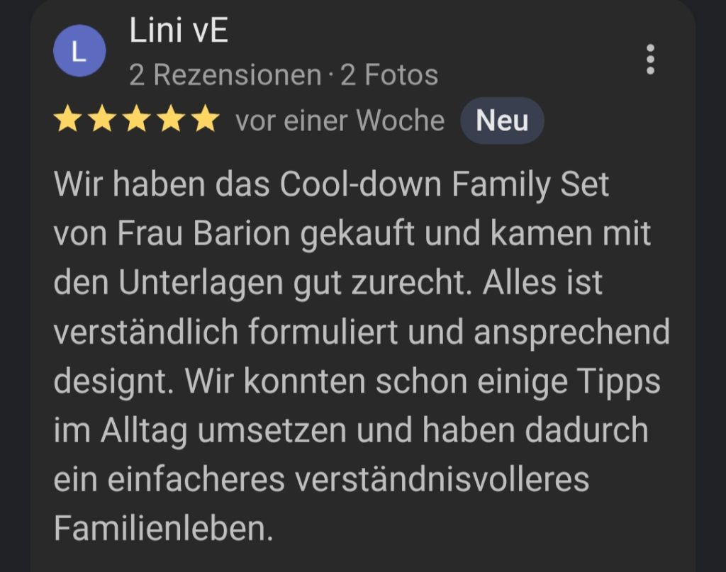 Das Cool-down Rundumpaket ist mehr als ein Notfallplan – es ist ein kompakter Begleiter, um Wut & Ärger Schritt für Schritt in Klarheit & Ausgeglichenheit zu verwandeln. Durch hilfreiche Selbstreflexion lernst du deine eigene Wut und die deines Kindes besser verstehen. Praktische Selbstfürsorge-Strategien und – im Alltag leicht umsetzbare – Selbstregulations-Übungen geben dir und deinem Kind sofort anwendbare Werkzeuge an die Hand, die eueren Familienalltag spürbar ruhiger, harmonischer machen.